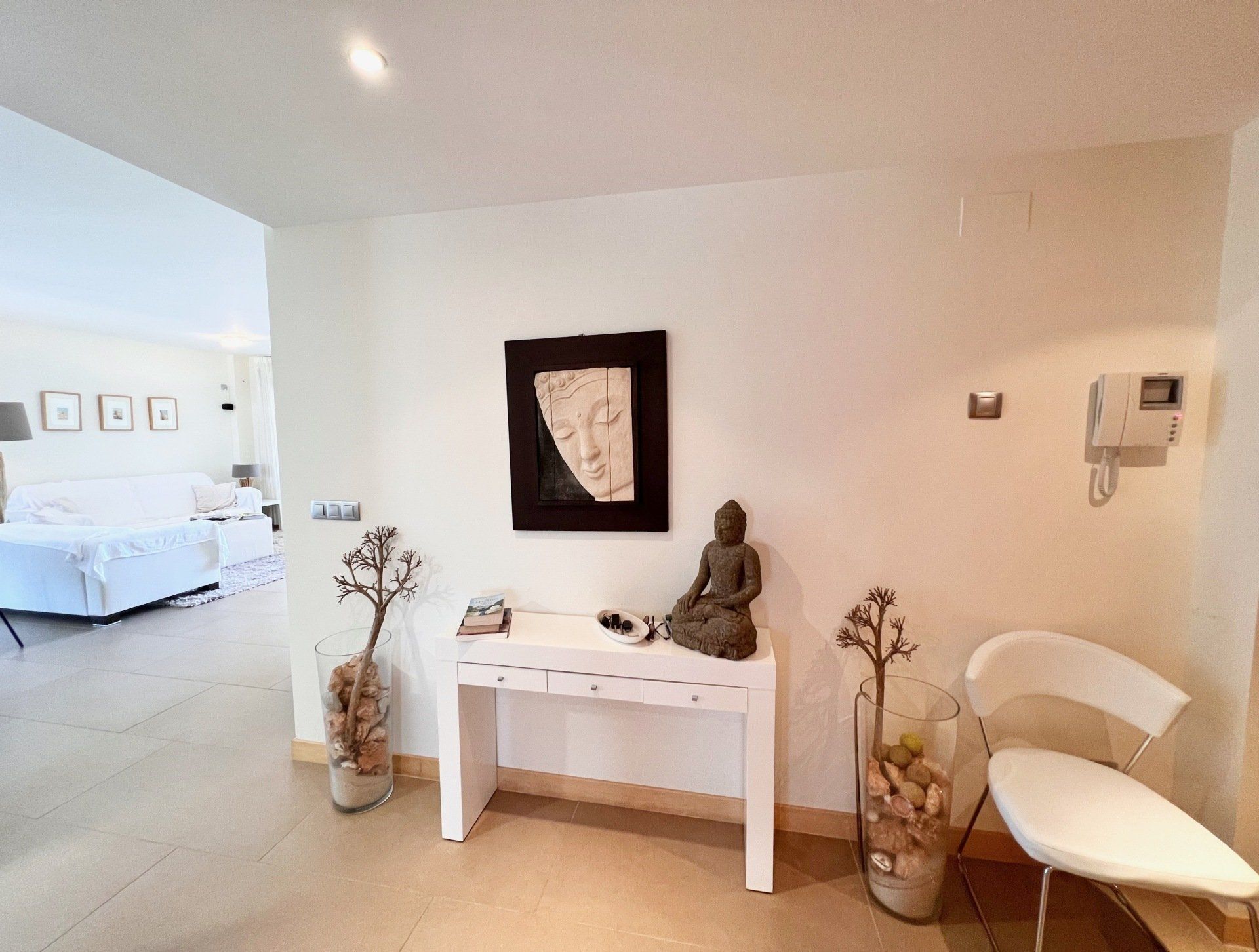 The apartment has two bedrooms and bathrooms, one of which is "en suite", and an open, light-flooded living-dining area. The fully fitted kitchen includes a large fridge freezer, hob, oven and Siemens microwave. A washing machine with integrated dryer is also located there.
