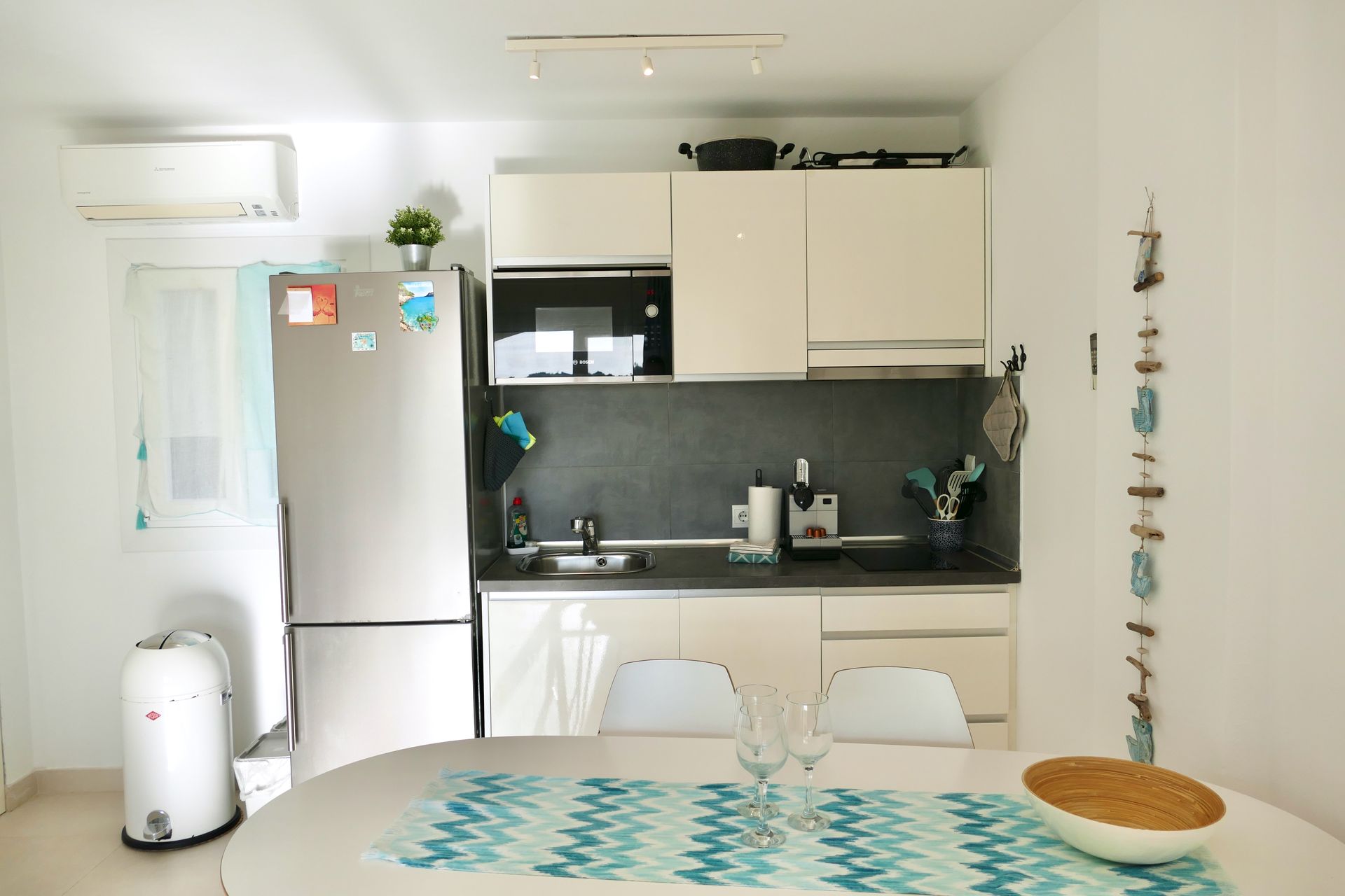 The modern kitchenette features a 2-ring ceramic hob, dishwasher, microwave, and fridge with freezer, plus all essential utensils – from coffee maker, kettle, and toaster to cookware, glasses, and dishes.