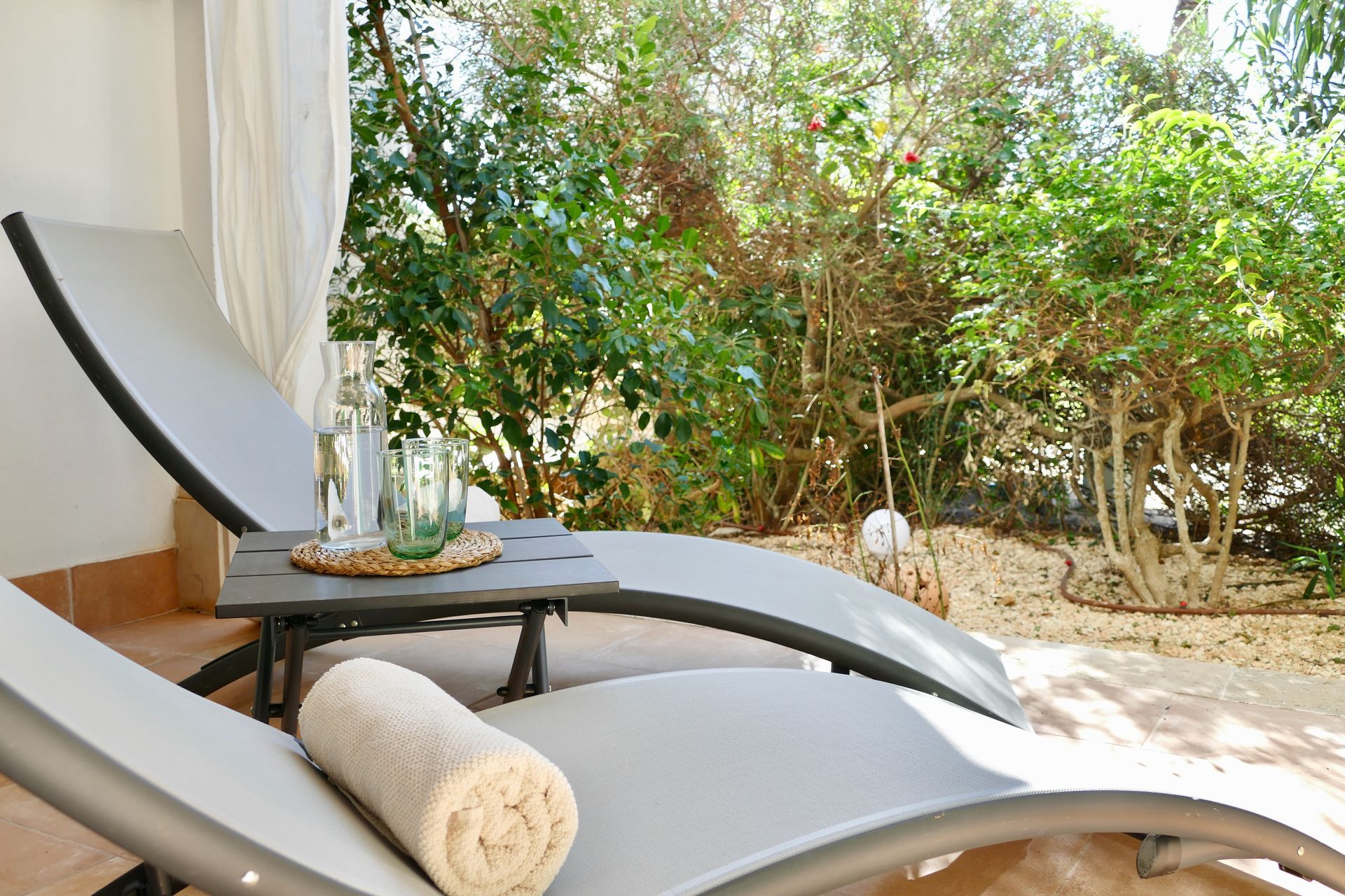 The bright, friendly and cosy 2-room holiday flat (approx. 50 m²) is located on the ground floor of a very well-kept holiday complex built in Mallorcan style with a communal pool and is approx. 250 metres from the beach of Cala Santanyi. The flat has a large outdoor terrace with seating and sunbathing areas and a beautifully planted front garden. The flat has an internet connection and WIFI.