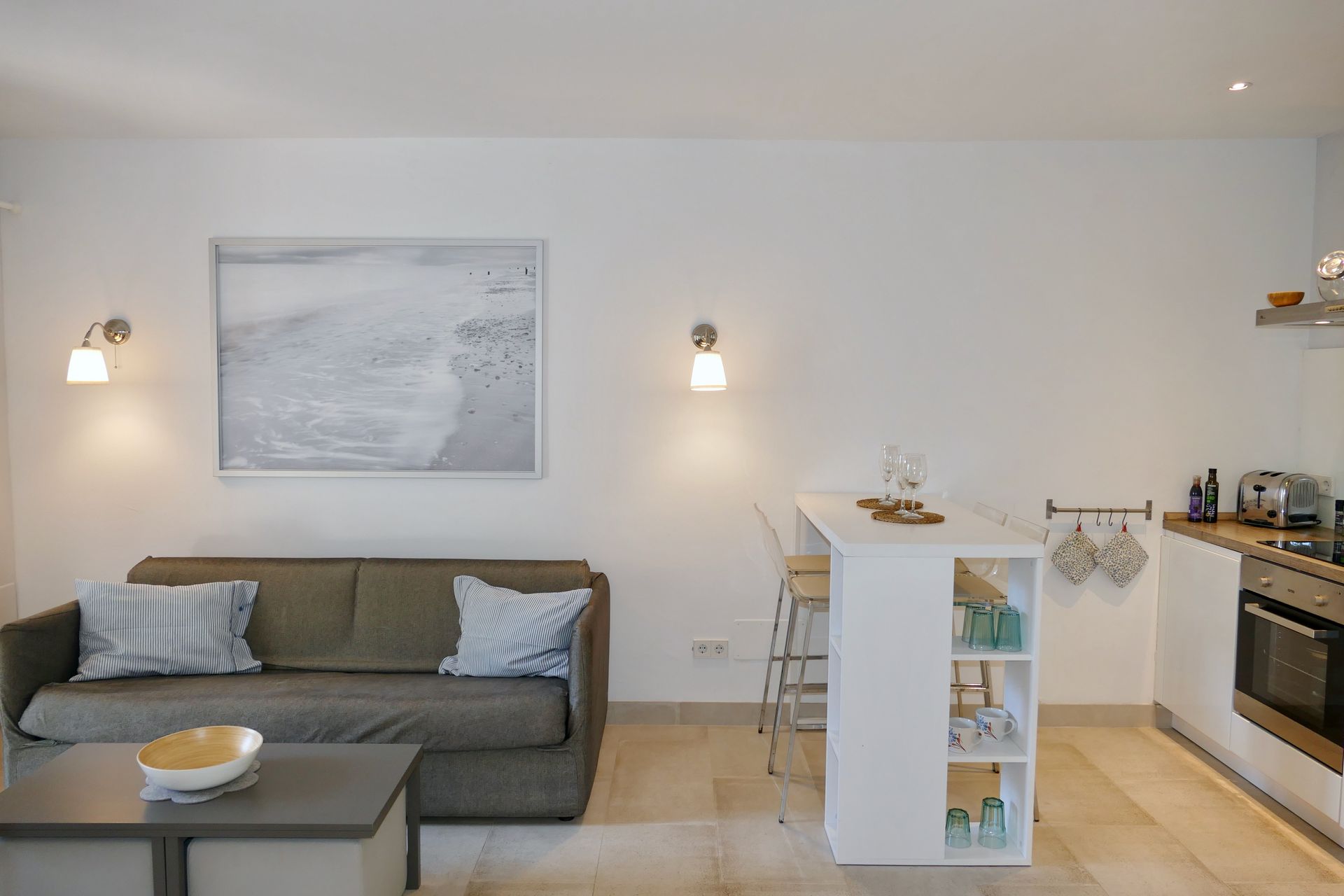 In the air-conditioned living/dining area with modern, open-plan Nolte fitted kitchen (dishwasher, cooker with oven, coffee machine, kettle and toaster) there is a satellite TV, a living room table with stools and a cosy couch, which can be converted into a comfortable bed (160 x 200 cm) if required. In the dining area there is a dining table with 4 chairs.