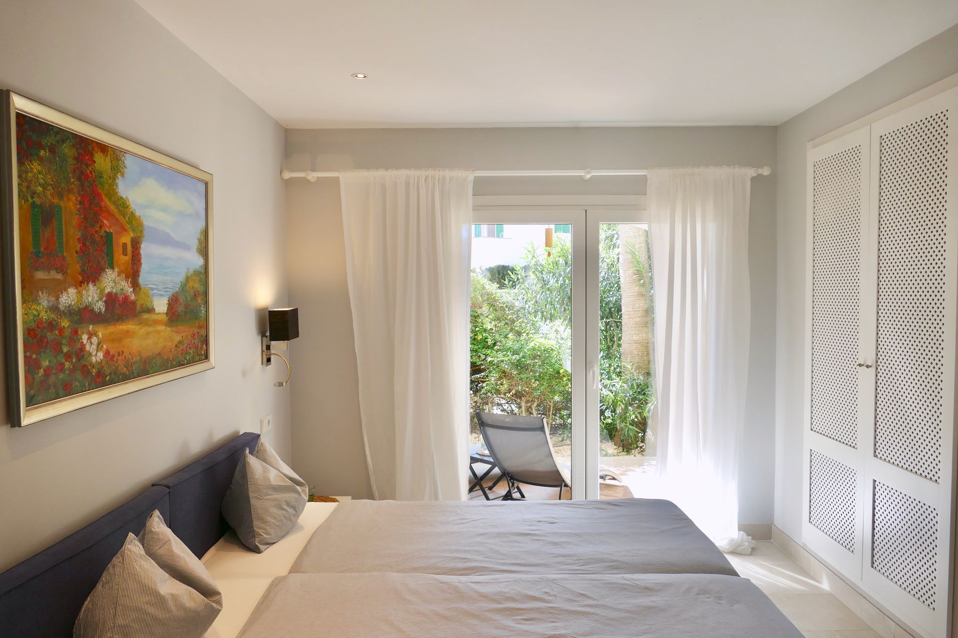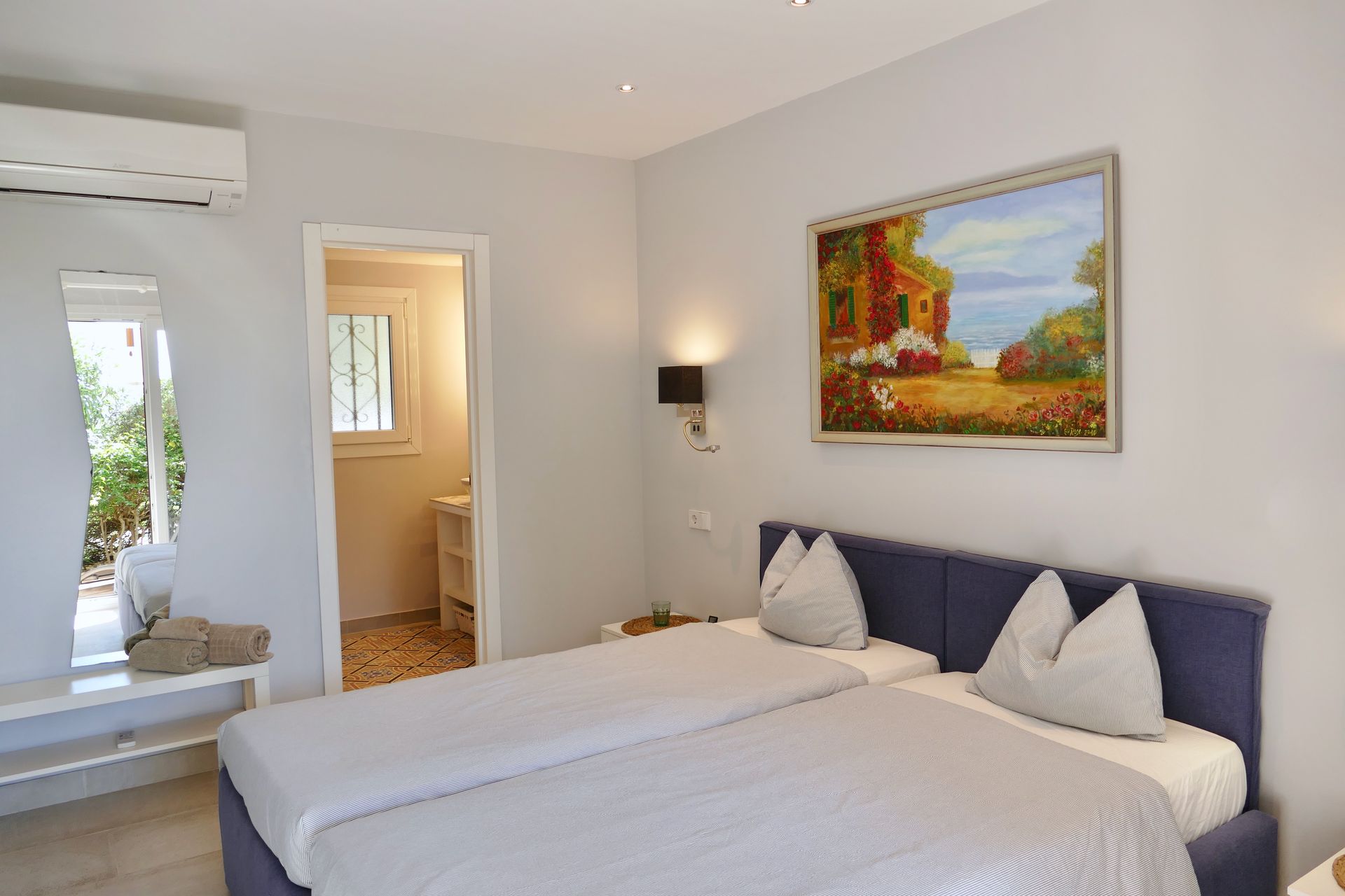 In the bedroom, which is also air-conditioned, you will find a spacious built-in wardrobe and a designer double bed with high-quality mattresses, which can also be converted into two single beds on request.