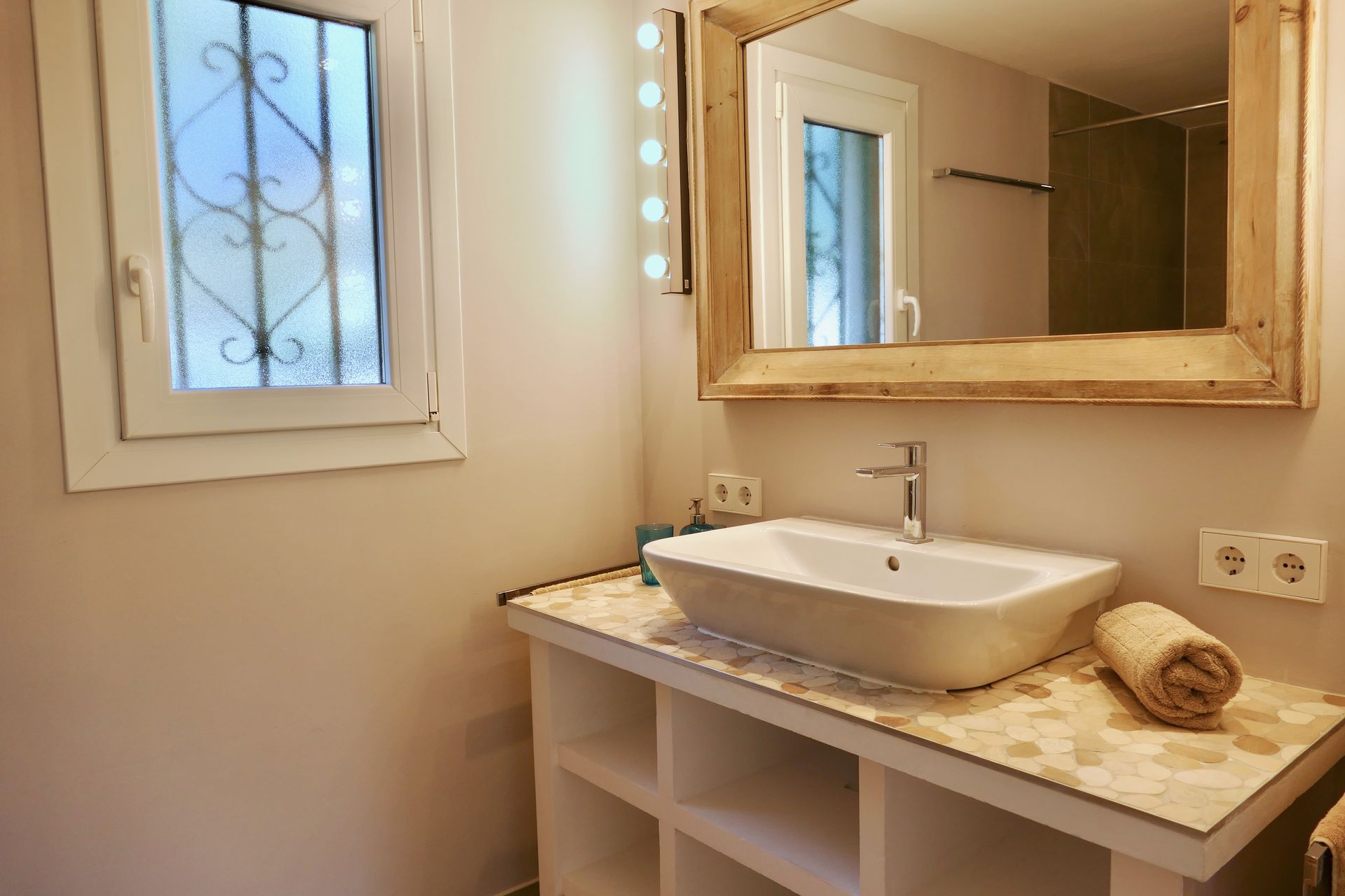 The cosy bathroom is equipped with a walk-in tropical shower, a large washbasin, a WC and an outside window.