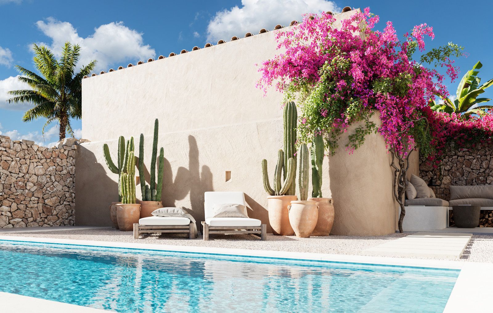 The two upper floors each feature a bedroom and a bathroom. The bedrooms have large glass fronts offering stunning views of the patio, the private pool, and the surrounding gardens. The bedroom on the second floor includes a balcony from which you can even see the sea in the distance. Additionally, on this floor, there is a study with a small terrace and a view of the church of Santanyí.