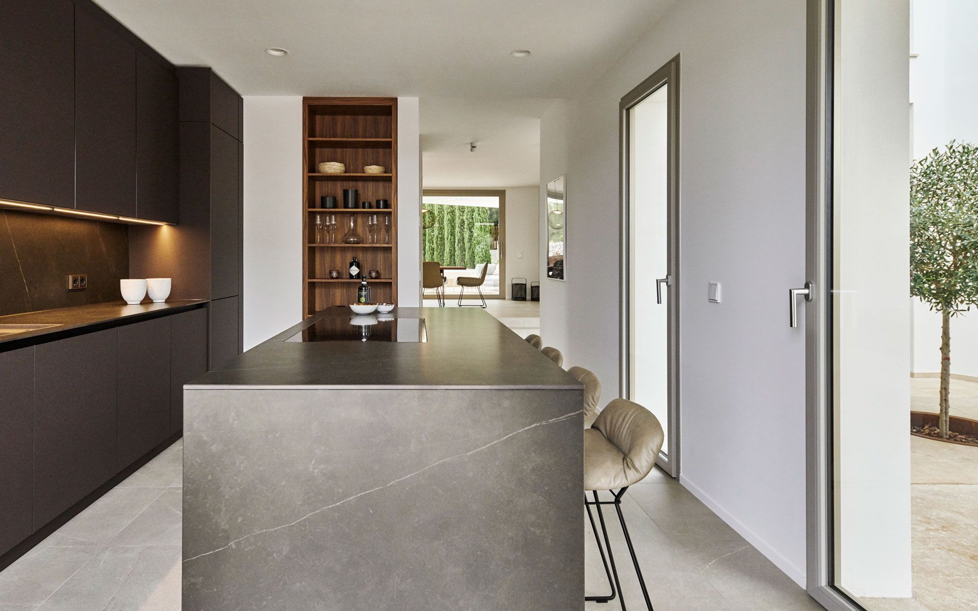 The ground floor impresses with its open layout and interconnected levels for the living and dining areas. The luxurious kitchen with an island, designed by a renowned German kitchen manufacturer, is a true highlight. It is equipped with top-of-the-line Gaggenau appliances and offers direct access to a welcoming courtyard with a cozy seating area. From here, the view opens through the lounge to the spacious saltwater pool (34 m2) – a fascinating play of transparency and elegance.