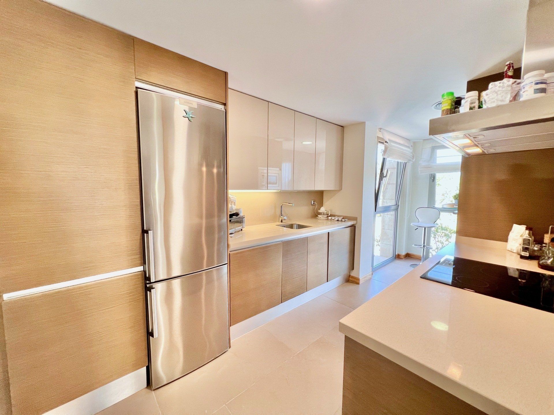 El apartamento tiene dos dormitorios y baños, uno de los cuales es "en suite", y una sala de estar-comedor abierta y muy luminosa. La cocina totalmente equipada incluye una gran nevera con congelador, vitrocerámica, horno y microondas Siemens. Allí también se encuentra una lavadora con secadora integrada.
