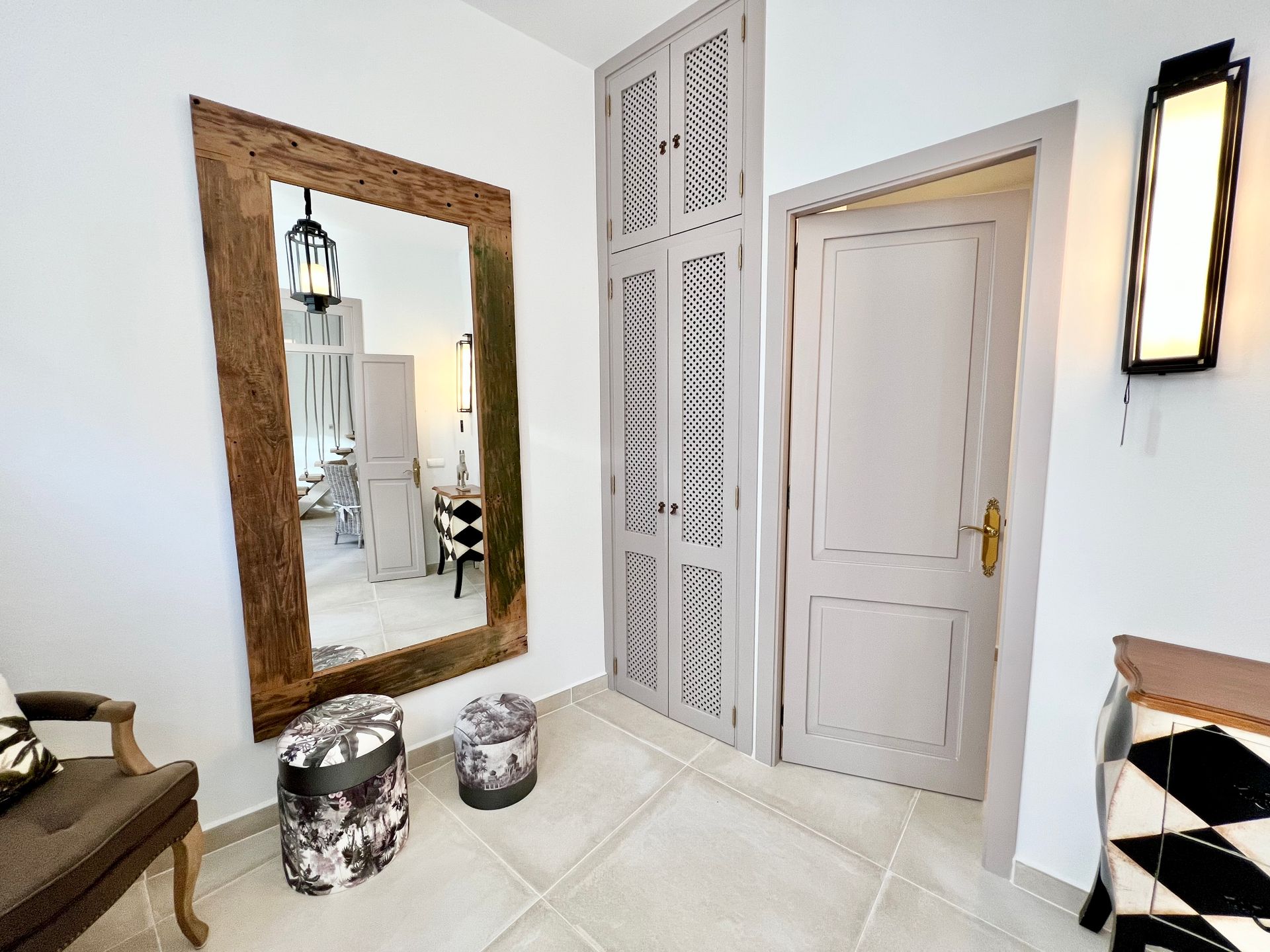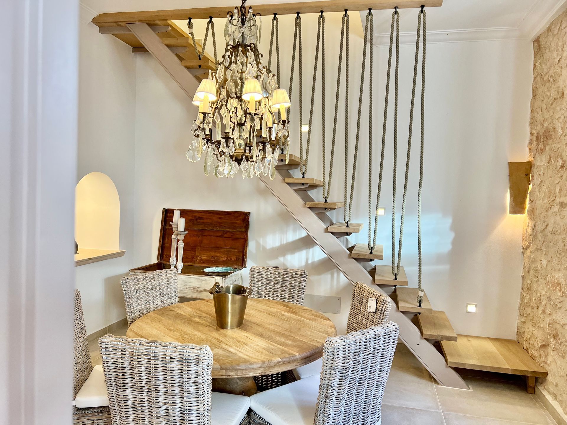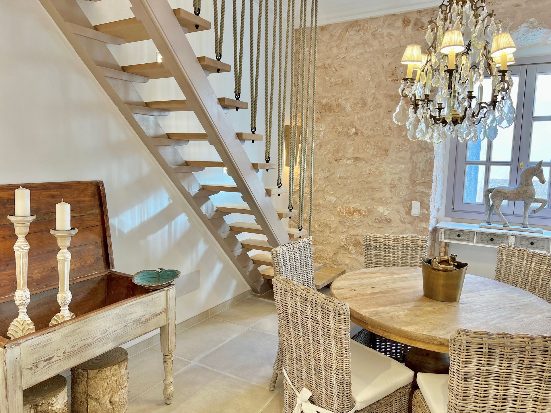 Muchos detalles de vida armoniosos exudan el estilo especial del sur en los dos pisos de la casa de pueblo. El diseño abierto de la planta baja crea bonitas habitaciones luminosas que invitan a la relajación en cualquier época del año. La sala de estar y el comedor, la cocina y el comedor exterior cubierto directamente contiguo ofrecen mucho espacio y diversión para momentos especiales de placer. La antigua chimenea de hierro fundido y otros detalles individuales, reacondicionados, "vintage" como las antiguas puertas de las habitaciones o las tradicionales fachadas de piedra mallorquina dan a las habitaciones un toque de alma histórica.