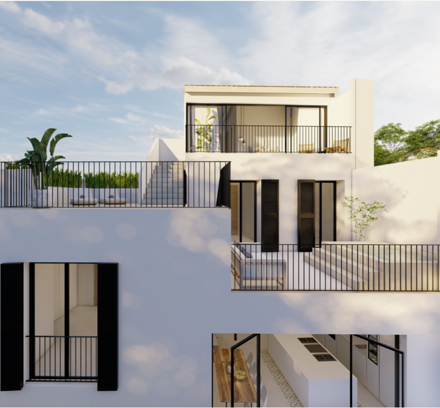 Esta única y lujosa casa adosada se está construyendo en el corazón de Santanyi a pocos pasos de la plaza del mercado en una tranquila calle lateral.