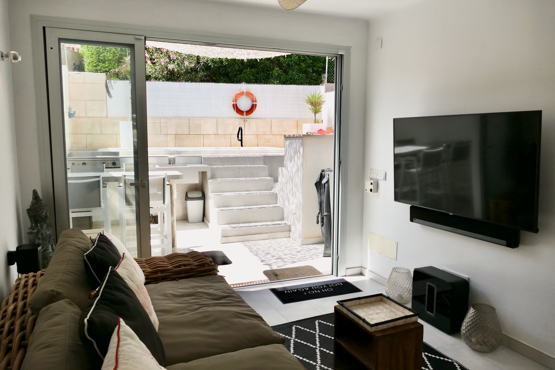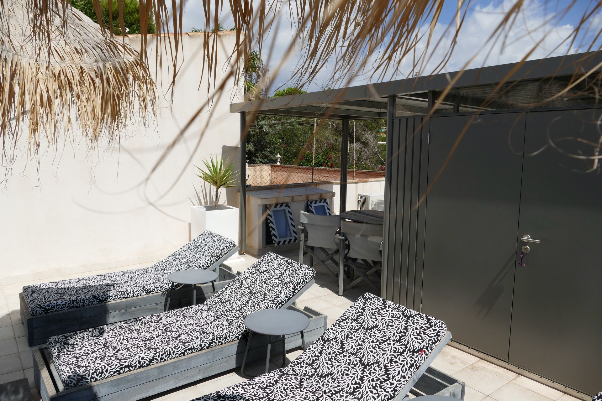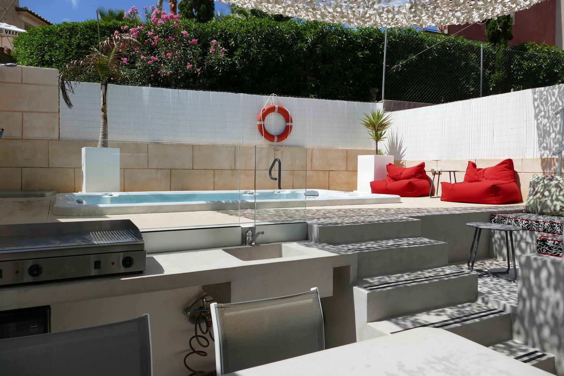Entras a la casa a través del luminoso jardín de invierno, que no solo sirve como entrada, sino también como una acogedora sala de estar/comedor. Luego ingresa a la cocina abierta y totalmente equipada con estufa Bora y la segunda sala de estar contigua. Desde aquí también se puede llegar a los dos dormitorios, cada uno con baño en suite y armarios empotrados hechos a medida. El área al aire libre ofrece una gran bañera de hidromasaje calentable con un sistema de contracorriente, que bordea la cocina al aire libre con asientos y un salón de ladrillo. Una escalera exterior te lleva a la gran terraza, donde puedes disfrutar del sol y de la vista lateral al mar durante todo el día. Tiene varias tumbonas, un comedor cubierto y un moderno trastero.