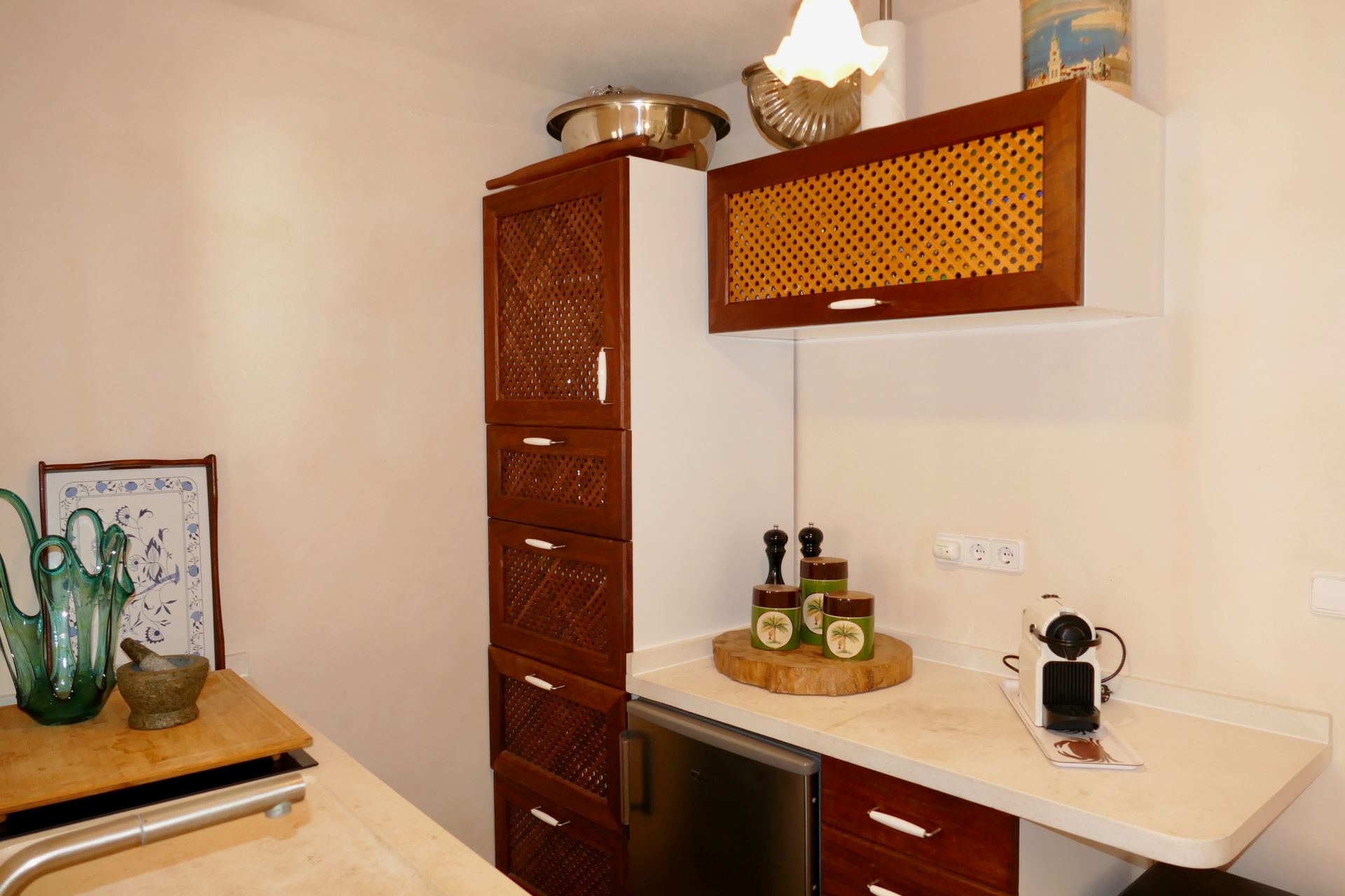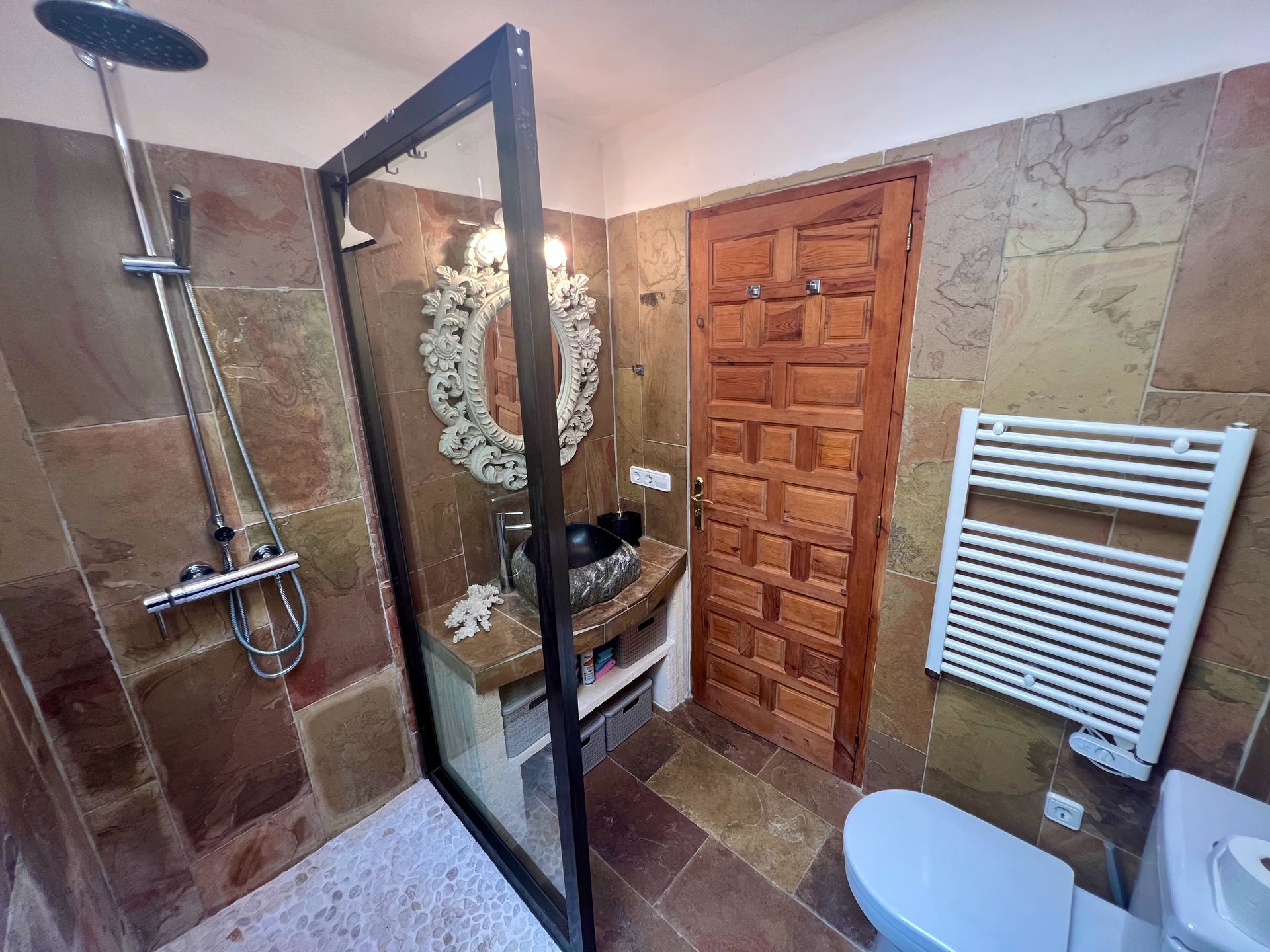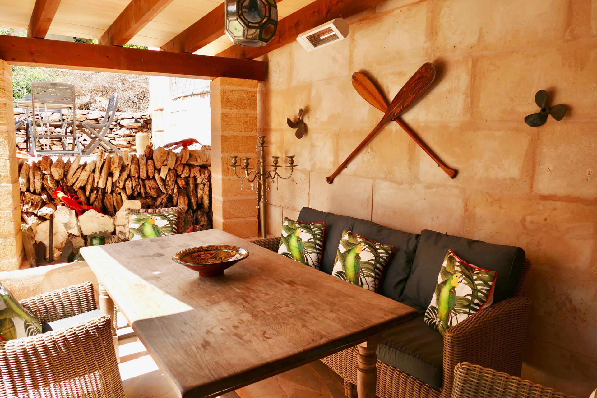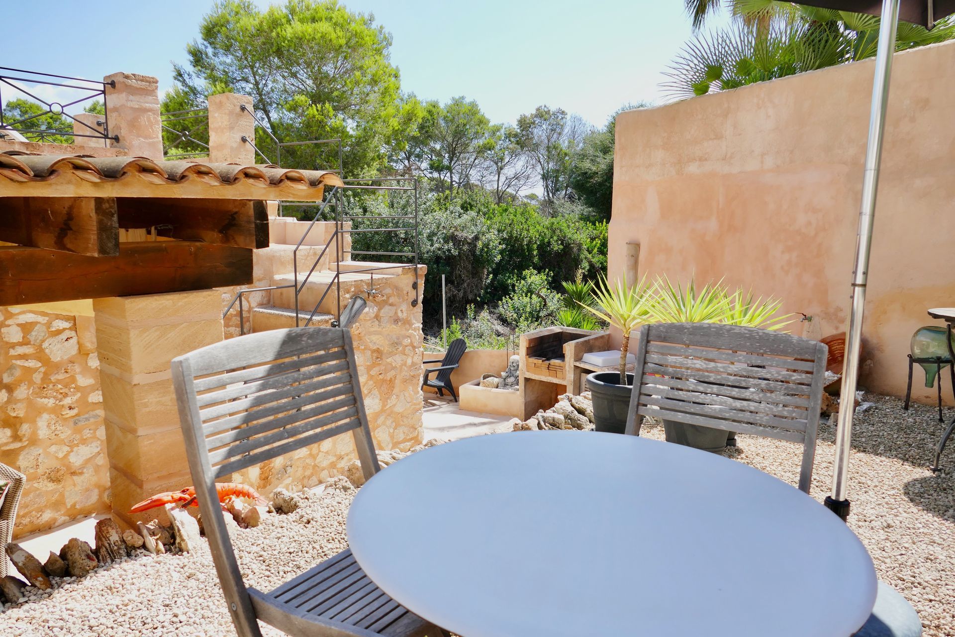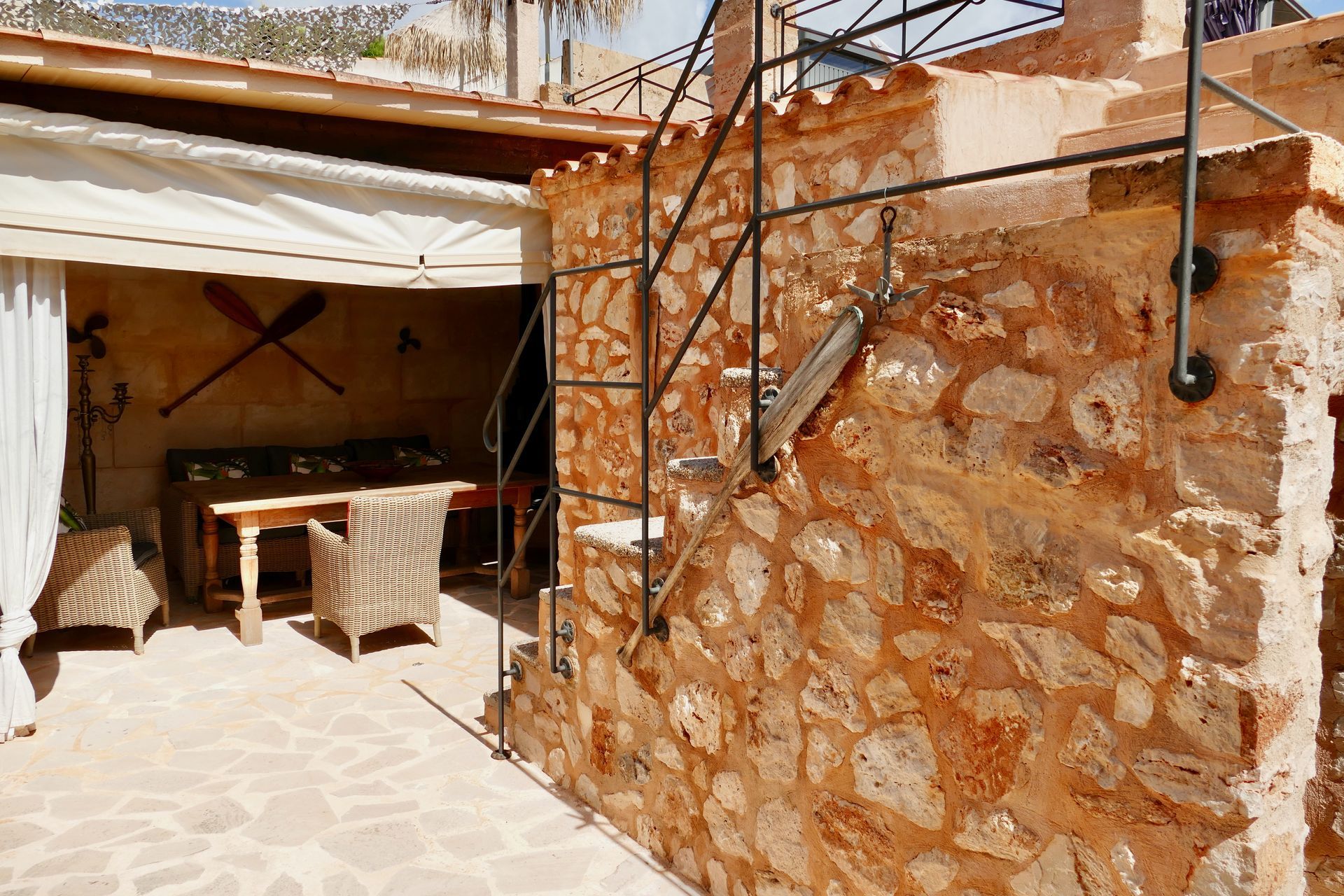 El chalet cuenta con una pared de piedra natural y fue renovado en 2009. Una escalera exterior conduce a la terraza de la recepción, que está equipada con muebles de alta calidad y una chimenea. Al entrar en la casa, la sala de estar abierta se abre con una secretaria y un armario. Desde aquí se puede acceder a los dos dormitorios contiguos, al baño ya la cocina completamente equipada. El siguiente es el comedor cubierto, que está equipado con calentadores infrarrojos de alta calidad y un cortavientos para los meses fríos. La terraza adyacente al comedor, que se extiende en diferentes niveles, tiene una cocina al aire libre, una mesa de comedor y una ducha al aire libre. Ya desde aquí se puede disfrutar de la fantástica vista al mar. Una escalera lo lleva a la gran terraza en la azotea con una hermosa vista al mar y un sofá cama marroquí cubierto y tumbonas, que ofrecen la posibilidad de relajarse tanto al sol como a la sombra.