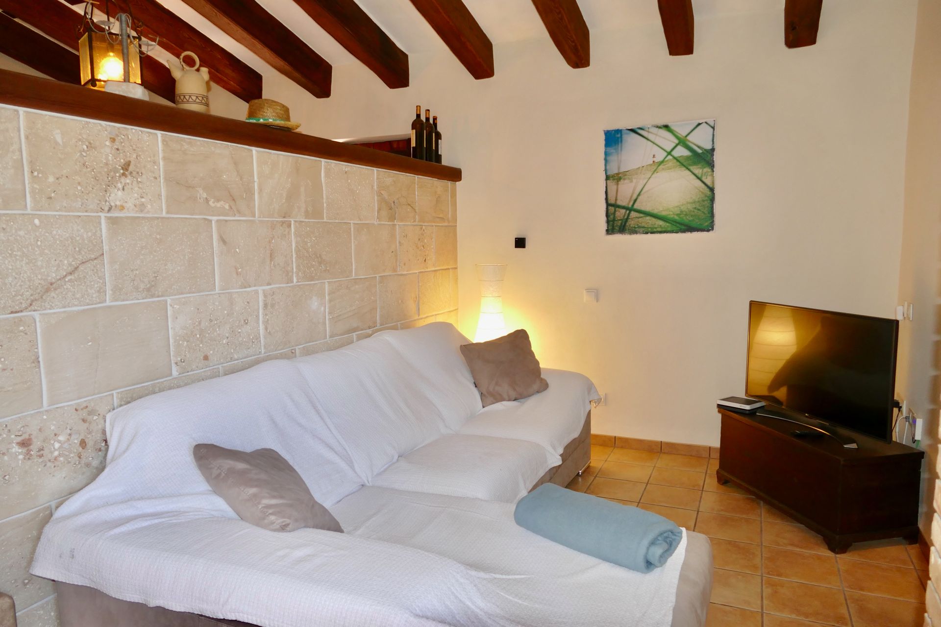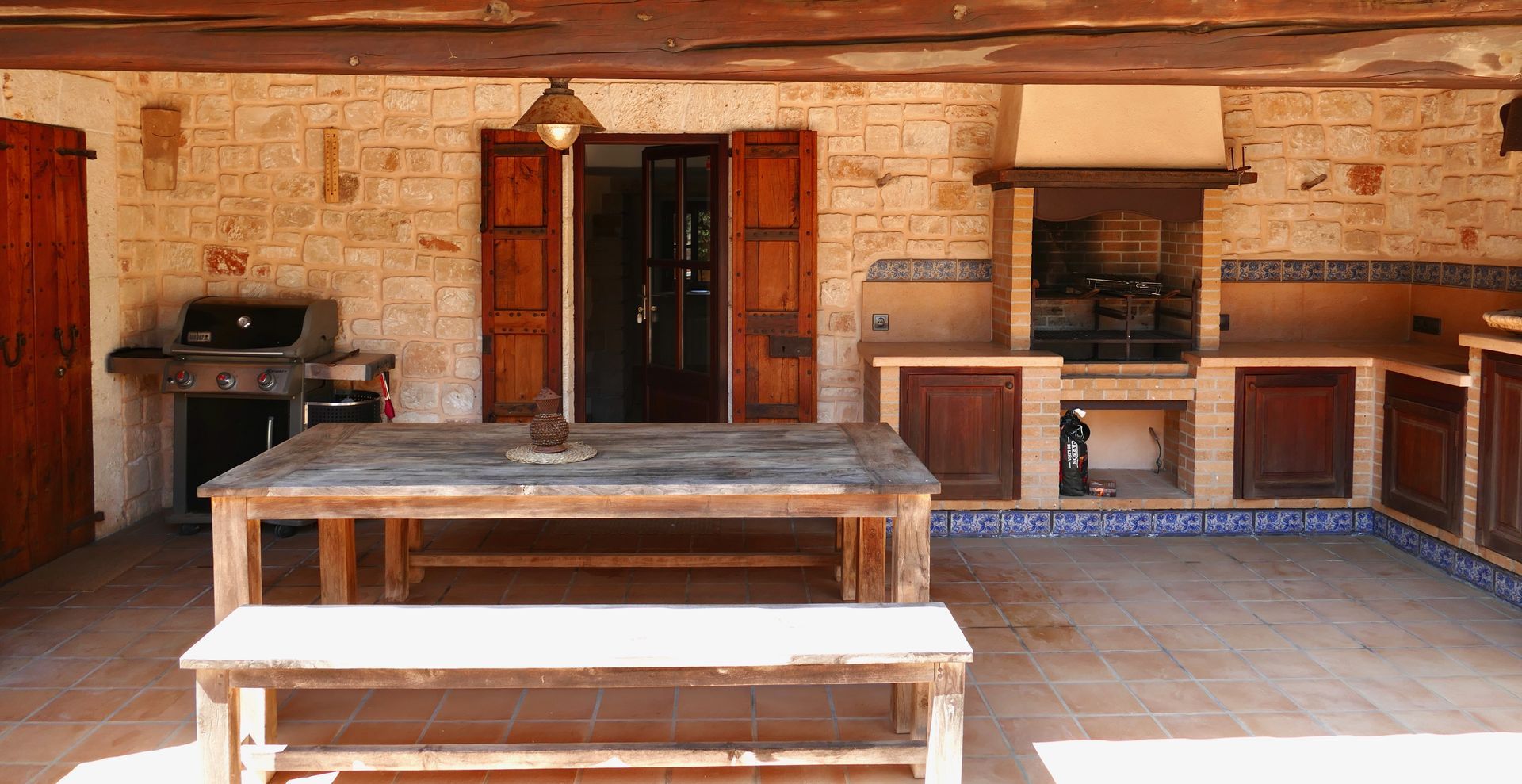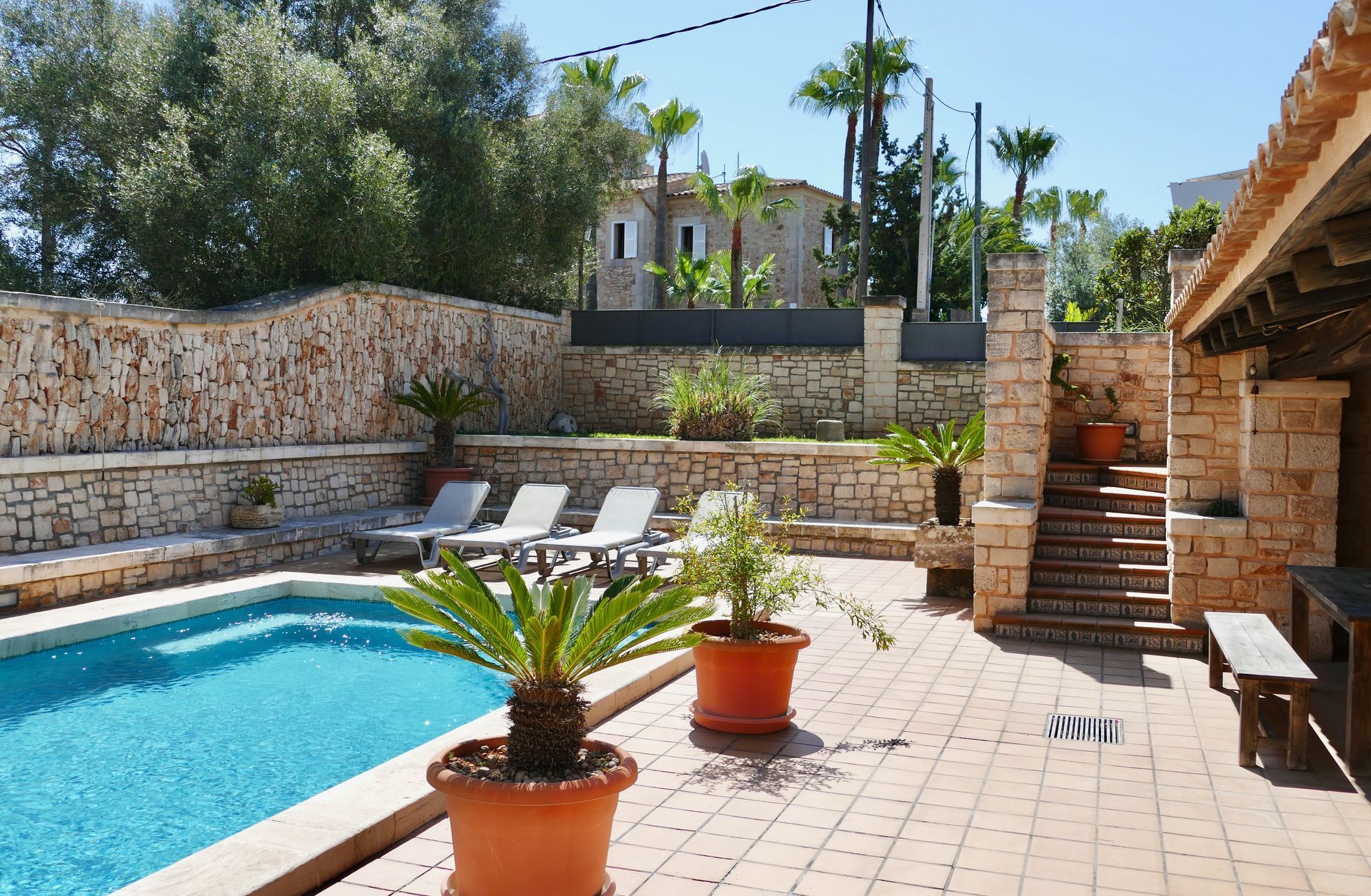 La propiedad destaca por el uso generoso de materiales naturales típicos de Mallorca, como piedra de Santanyí, muros de piedra en seco y piedra de Binissalem. Las vigas de madera vista y las puertas rústicas antiguas completan el encantador estilo del chalet.
