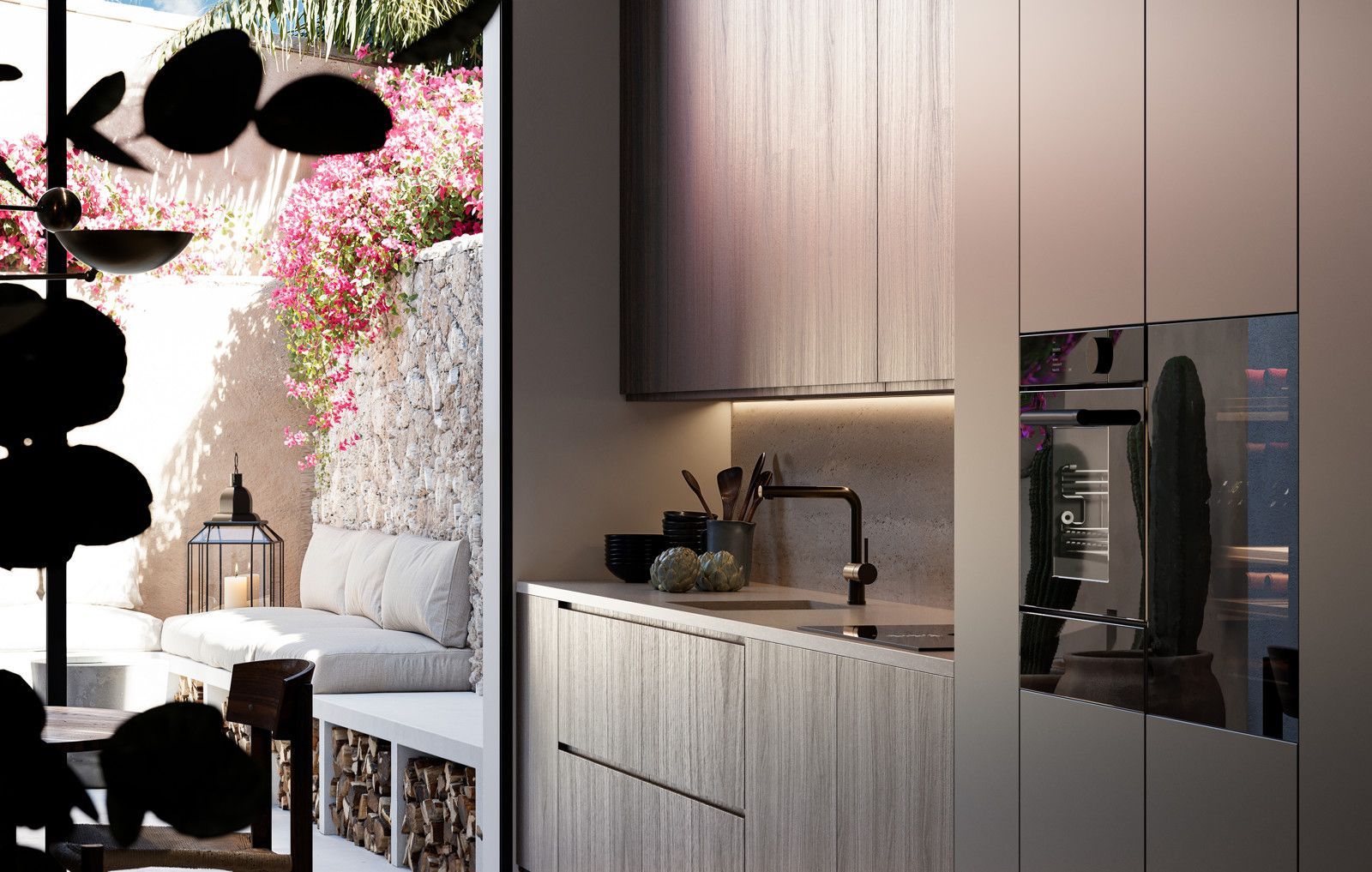 Los materiales utilizados en la casa han sido elegidos con mucho cariño por la propietaria. Para las dos plantas superiores se ha optado por suelos de madera, y para la planta baja y los baños, por microcemento. En el patio se ha colocado una piedra natural en formato 60x60, que se repite en tamaño y color en la piscina.