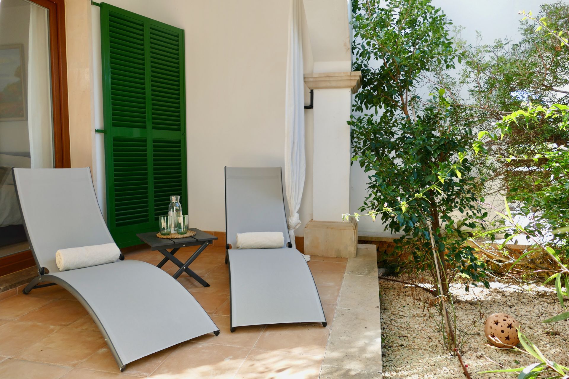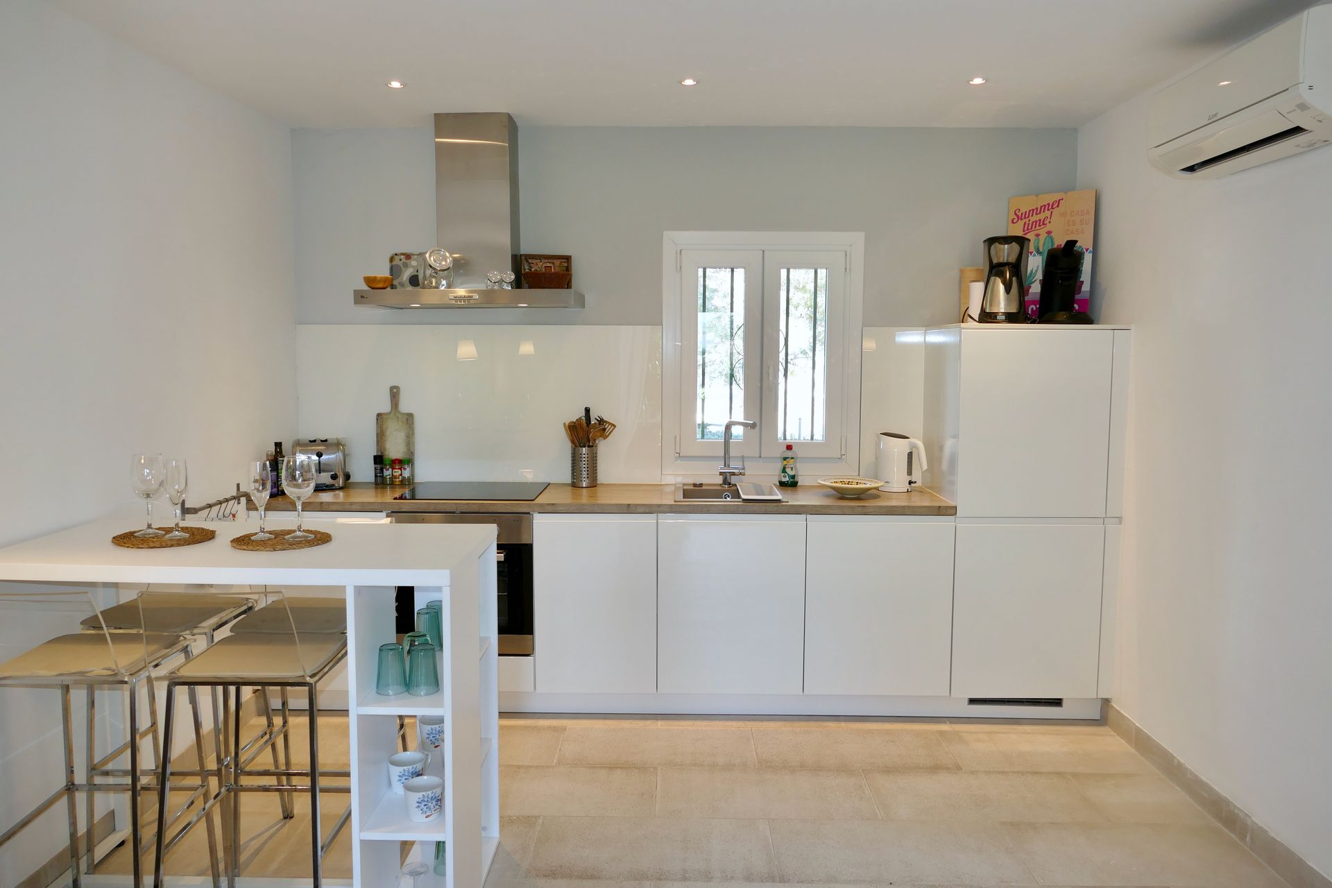 Im ebenfalls klimatisierten Schlafzimmer finden sie einen großzügigen Einbauschrank und ein Designer-Doppelbett mit hochwertigen Matratzen vor, das auf Wunsch auch in zwei Einzelbetten umgewandelt werden kann.