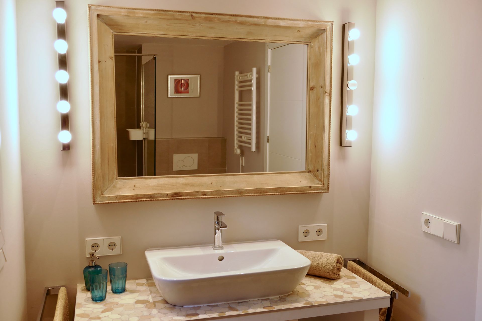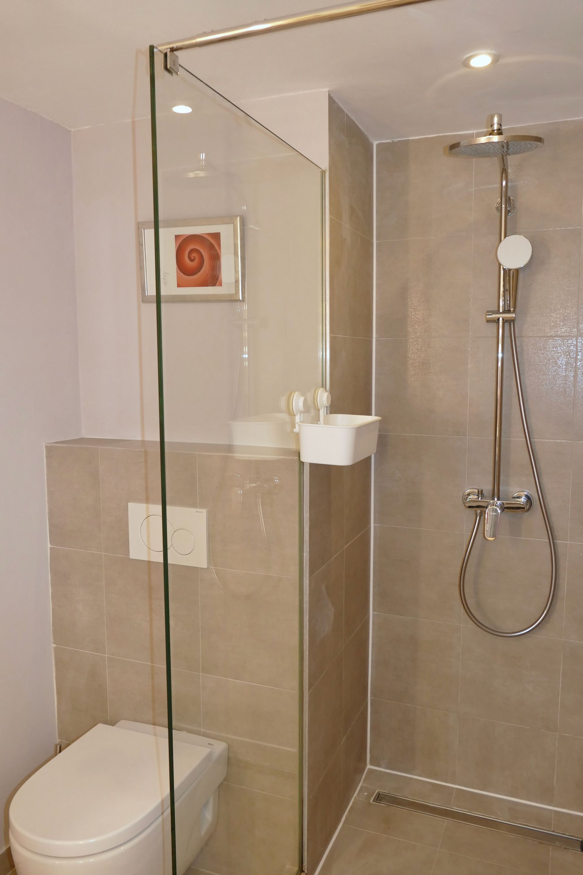 Das freundliche Badezimmer ist mit einer ebenerdigen Tropen-Dusche, einem großen Wachbecken, dem WC und einem Außenfenster ausgestattet.