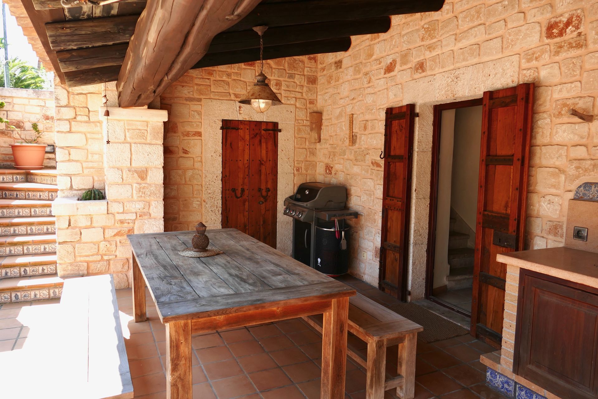 Das Haus besticht durch den Stil traditioneller mallorquinischer Baukunst, mit Naturstein aus Santanyí und Binissalem, Bruchsteinmauern, antiken Holzbalken und liebevoll restaurierten Landhaustüren. Jedes Detail zeugt von Qualität und Charakter.