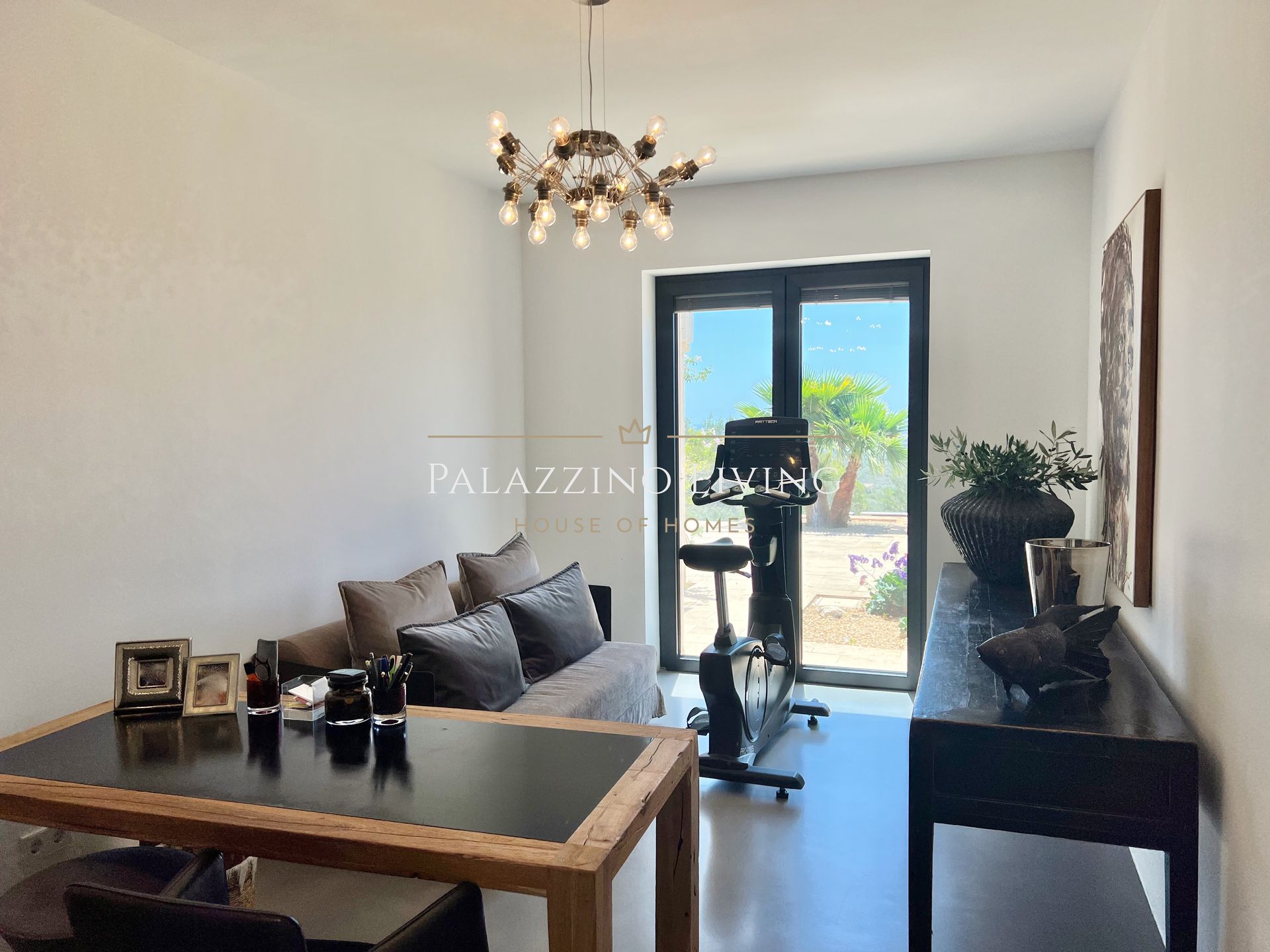 Die Ausstattung dieser Immobilie lässt keine Wünsche offen. Neben einem Wellnessbereich mit Sauna gibt es außerdem ein Atelier, einen maßgefertigten Weinschrank, eine zentrale Klimaanlage und Fußbodenheizung. Der asphaltierte Zuweg zur Finca endet in der Tiefgarage mit drei Stellplätzen und rundet das Angebot ab.